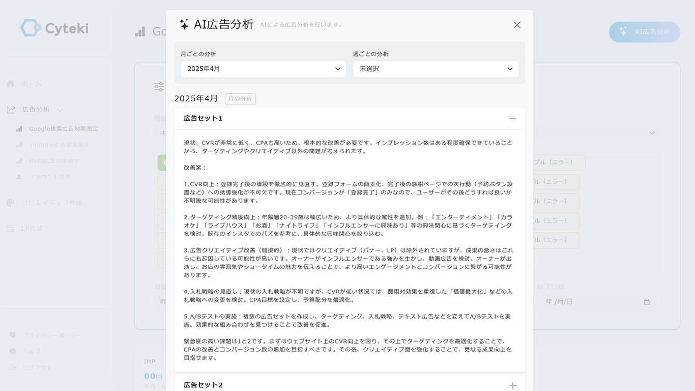 改善提案が自動で出てくるため、属人化せずに改善サイクルが止まらなくなります。広告が「出しっぱなし」で終わることがなく、成果が積み上がっていきます。